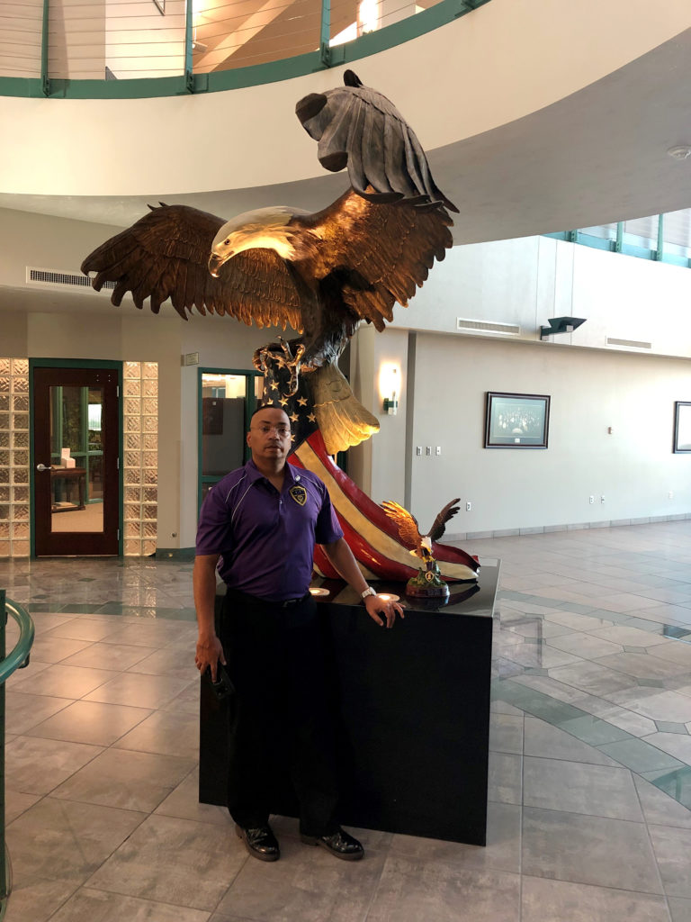 Miguel’s Purple Heart is held in the talons of the smaller eagle statue at the base of Farm Bureau’s The Color Guard eagle statue.